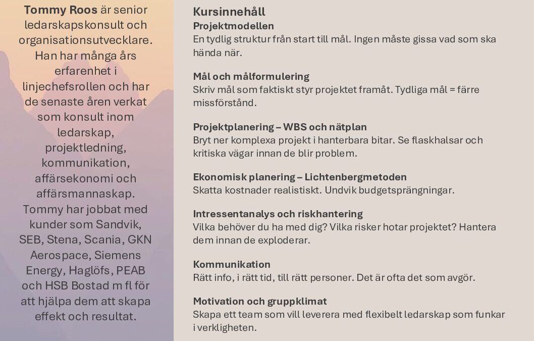 Öppen utbildning Effektfull projektledning av Agneta Björnström | feb 9, 2026 | 0 Kommentarer Skicka kommentar Avbryt svarDin e-postadress kommer inte publiceras. Obligatoriska fält är märkta *Kommentar * Namn * E-postadress * Webbplats Spara mitt namn, min e-postadress och webbplats i denna webbläsare till nästa gång jag skriver en kommentar.